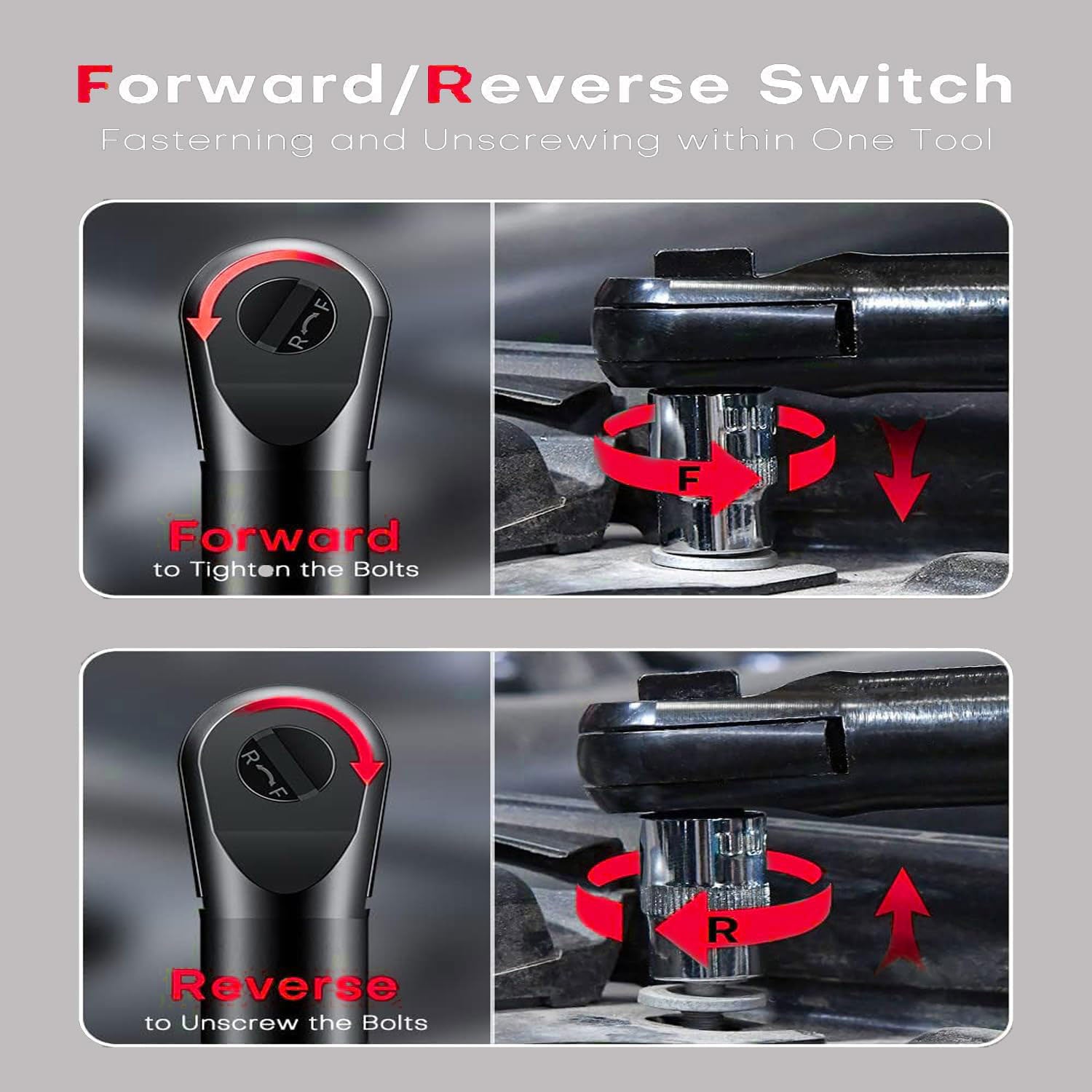 Alternar marcha atrás y adelante: Una vuelta para cambiar la marcha atrás y adelante de esta llave de trinquete.